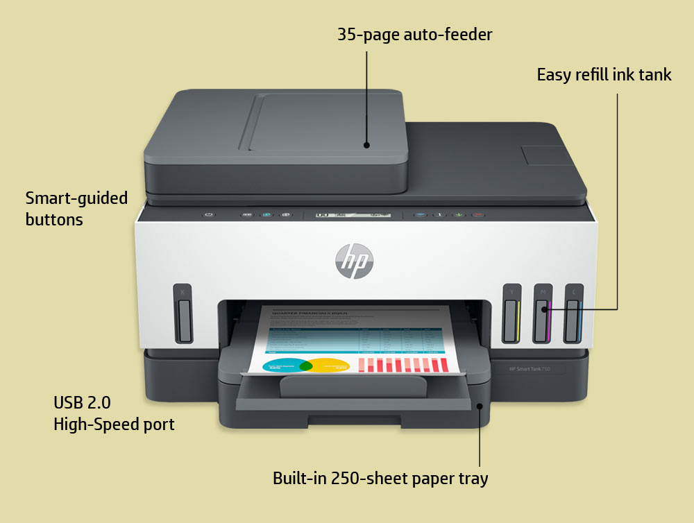 HP Smart Tank 750 All-in-One – Impresora multifunción – color – chorro de tinta – rellenable – Letter A (216 x 279 mm)/A4 (210 x 297 mm) (original) – A4/Legal (material) – hasta 13 ppm (copiando) – hasta 15 ppm (impresión) – 250 hojas – USB 2.0, LAN, Wi-Fi(n), Bluetooth